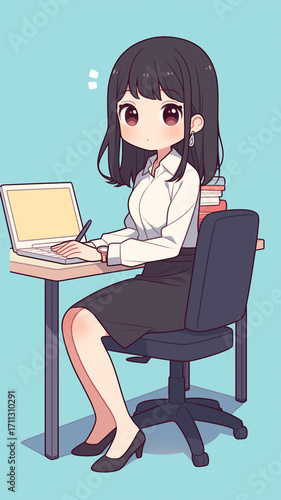 ノートパソコンに向かってコーディングや文章作成に励む女の子のアニメイラスト。在宅勤務、フリーランス女子、タイピング、集中、IT女子、クリエイティブ、仕事風景、現代風の空間。