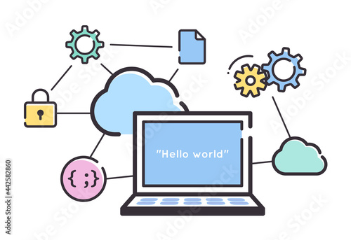 シンプルな線のノートパソコンとネットワークのイメージ_IT_カラフル