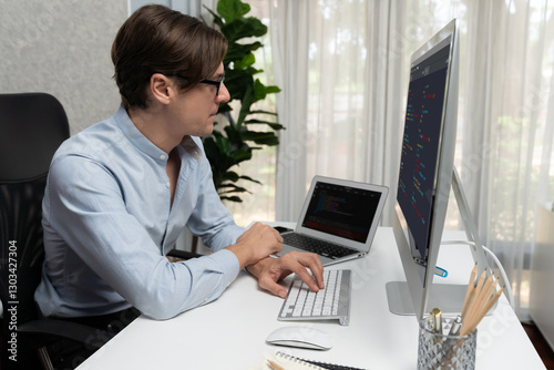 IT developer looking at online software development information on pc align working laptop with coding program on updated version application project trial creating new code overall system. Pecuniary.