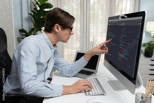 IT developer selecting by point on coding online software development information on pc comparing with laptop screen of new code program's update version firmware overall system project. Pecuniary.