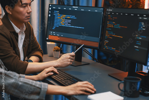 IT developers discussing with point to intelligent website development coder system running data online two screens information technology at neon light room at modern office. Infobahn.