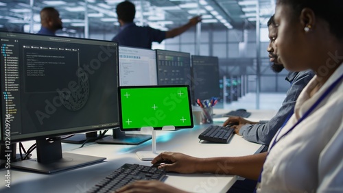 IT experts using green screen tablet, working together in server farm to optimize it for data processing requirements. Close up of coworkers coding on chroma key device in data center, camera A
