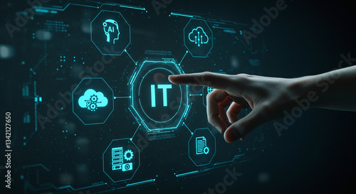 IT Innovation: Hand interacts with a digital interface representing advanced information technology, AI, and cloud computing, in a modern tech environment.