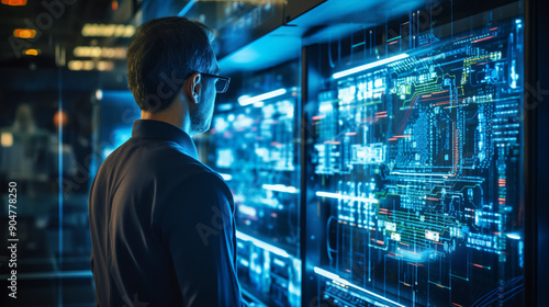 IT Specialist, software engineer working with AI and data analysis, data center as background. AI technology, autimatic solution for database management, data engineering, technology background.