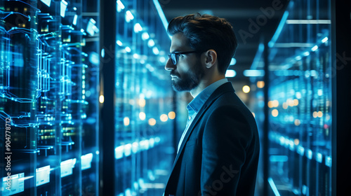 IT Specialist, software engineer working with AI and data analysis, data center as background. AI technology, autimatic solution for database management, data engineering, technology background.