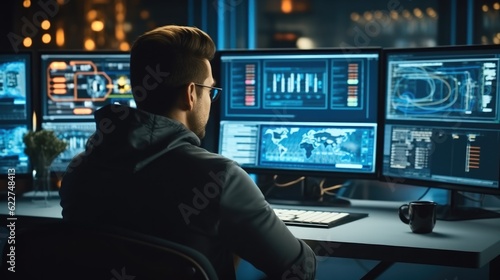 IT Specialist Works on Personal Computer with Screens Showing Software Program with Coding Language Interface, Technical Room of Data Center.