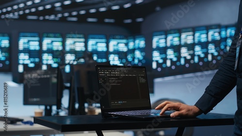 IT support employee writing code on laptop in high tech facility with server rows providing computing resources for different workloads. System administrator uses notebook to oversee supercomputers