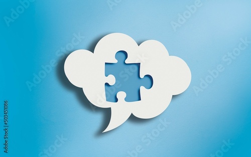 Jigsaw Puzzle Icon in White Cloud Speech Bubble on Blue