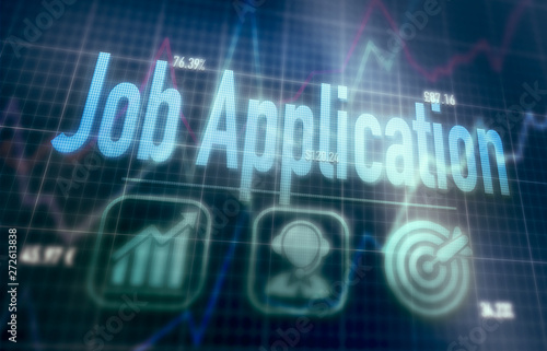 Job Application concept on a blue dot matrix computer display.
