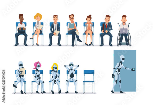 Job Interview Recruiting and Robots. Vector.