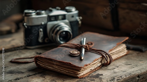 Journal and Camera on Rustic Wood Tabletop Ready for Travel Planning