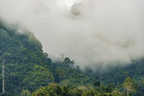 Karst mountains shrouded in clouds, rainforest, Nong Khiaw, Luang Prabang, Laos, Asia