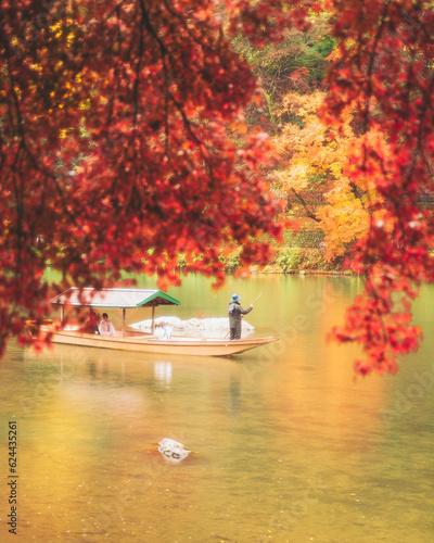 Katsura River, Kyoto, Japan - 23 November 2022: View of a rowing man on a boat tour crossing the Katsura River from Kameyama Park in Kyoto, Japan.