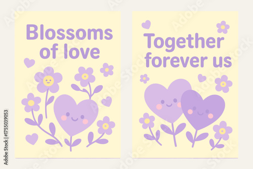 Kawaii Love Blossoms. Blossoms of love. Two vertical A6 banners with safe margins, centered composition, no elements touching edges, kawaii, pastel yellow and