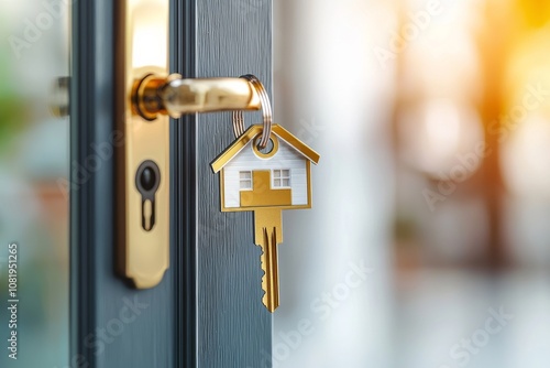 Key with a house-shaped keychain inserted in a door lock, symbolizing homeownership and new beginnings.