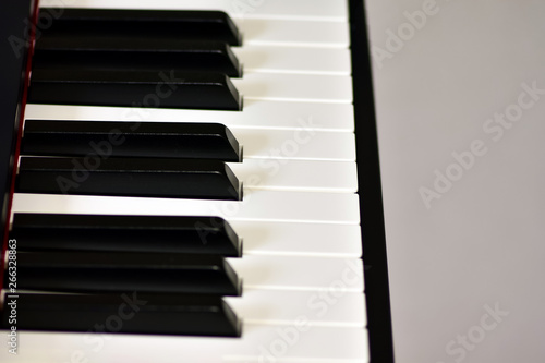 Keys of a digital piano, soft focusing, creative mood of a person improvisation and creativity. Midi piano keyboard for playing digital music and making remixes.