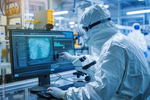 Lab technician analyzing with microscope and computer