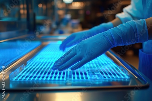 Lab worker checks glowing samples; sterile background