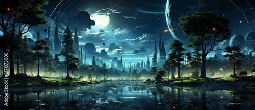 Labeled AI governed urban park, front view, neon nature fusion, vivid, digital binary as object, Analogous Color Scheme