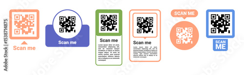 Labels with generated qr codes for retail business or branding. Vector in flat style, isolated set of stickers with barcode for payment or brand recognition advertisement. Scan me symbol with text