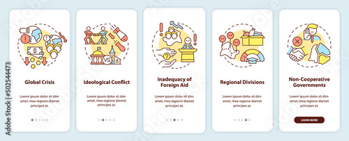 Lack of international cooperation problems onboarding mobile app screen. Walkthrough 5 steps graphic instructions pages with linear concepts. UI, UX, GUI template. Myriad Pro-Bold, Regular fonts used