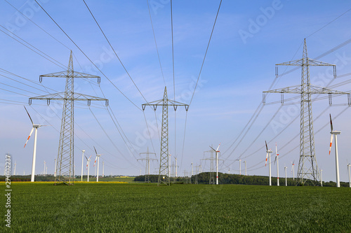 Landscape with high-voltage masts against the blue sky