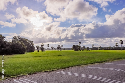 landscape with road, paddy and clouds