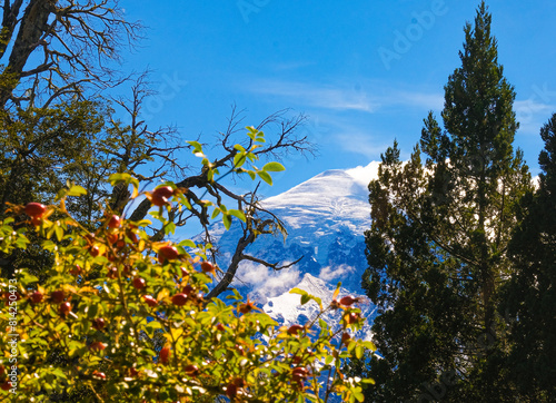 Lanin volcano frame by cassis fruit surrounded by clouds, clear summit in sight and ice glaciers, between Argentina and Chile, Lanin National Park