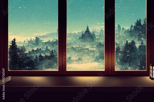 lantern and pillows on windowsill with winter view