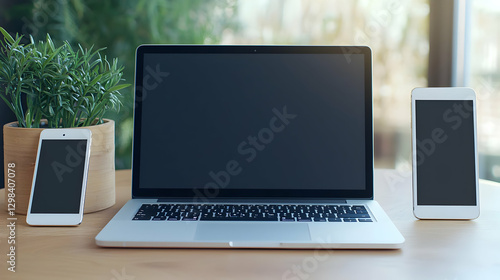Laptop and Smartphones on Wooden Table with Green Plant Next to Bright Window
