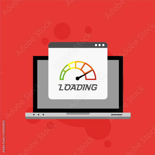 Laptop browser with speedometer test showing loading speed time. Vector illustration