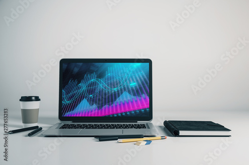 Laptop closeup with forex graph on computer screen. Financial trading and education concept. 3d rendering.