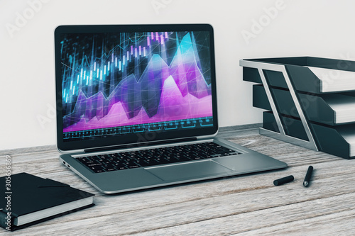Laptop closeup with forex graph on computer screen. Financial trading and education concept. 3d rendering.