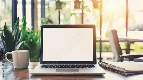 Laptop, Coffee and Notepad on Table in Cafe.
