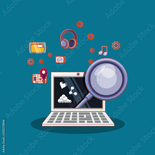 laptop computer and lupe with social media related icons over blue background, colorful design. vector illustration