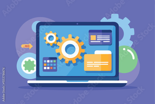 Laptop computer displaying software update screen with gears, icons, and progress elements in a colorful design