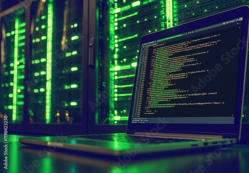 Laptop Displaying Coding Data with Green Server Rack in Background at Night