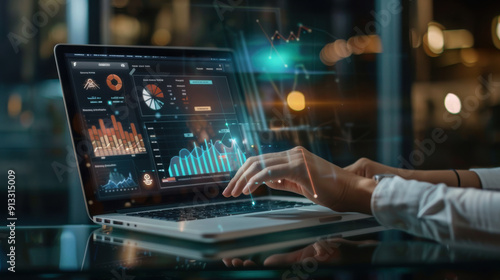Laptop displaying graphical data interface as a marketer reviews online ad campaigns and performance metrics. Digital marketing concept for website and social media ads.