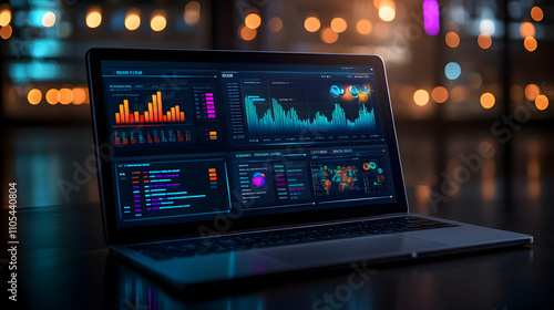 Laptop Displays Data Analytics Charts and Graphs at Night