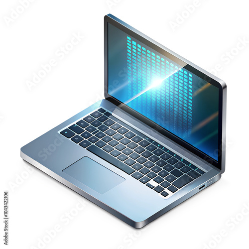 Laptop icon in isometric view, metallic silver, with glowing screen displaying code