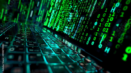 Laptop keyboard green binary code representing cross-site scripting cyber security