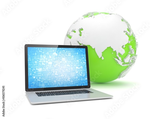 Laptop network and earth globe. 3d render