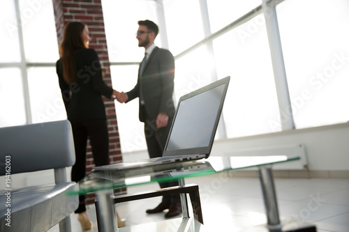 laptop on the desk, background handshake