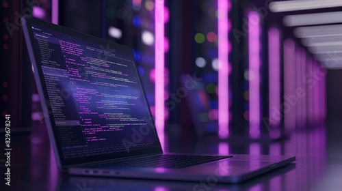 Laptop screen displaying intricate cloud service API code, with a sleek, blurred data center in the background, creating a dramatic and tech-forward composition with copy space