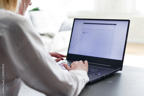 Laptop screen. Woman uses her notebook computer while sitting at desk