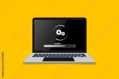 Laptop update screen. Loading or update process in laptop screen. Install software, operating system, update support, data update or synchronize with bar process