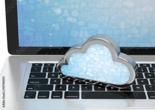 Laptop with cloud computing symbol on keyboard. 3d render