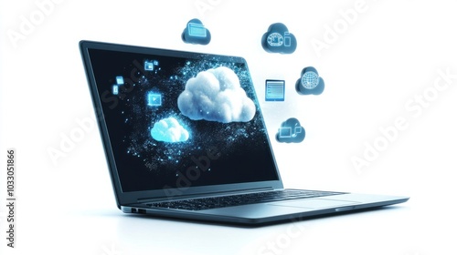 Laptop with cloud computing symbols floating above, representing cloud-based learning tools, isolated on white background