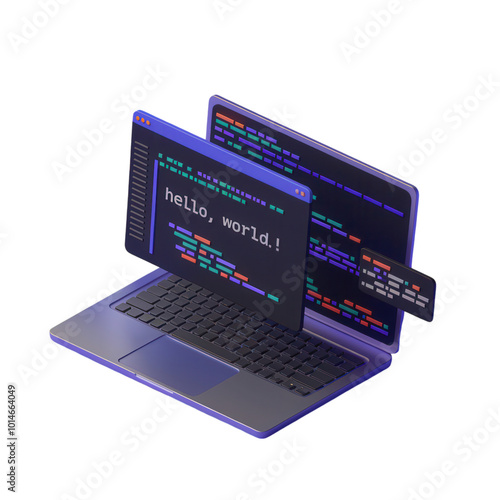 Laptop with code screen displaying 'hello, world!' on transparent cutout, PNG file