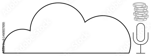 Large cloud outline with a vertical microphone and stacked disk shapes. Ideal for technology, data storage, communication, AI systems, voice recognition, cloud computing, simple flat metaphor